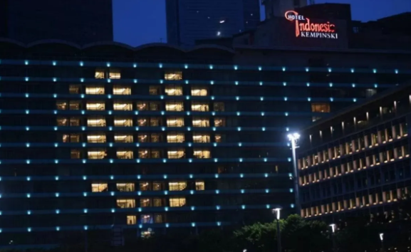 Deretan lampu kamar yang dinyalakan membentuk simbol hati (love) terlihat dari salah satu hotel di Jakarta. (Dok. Ist)